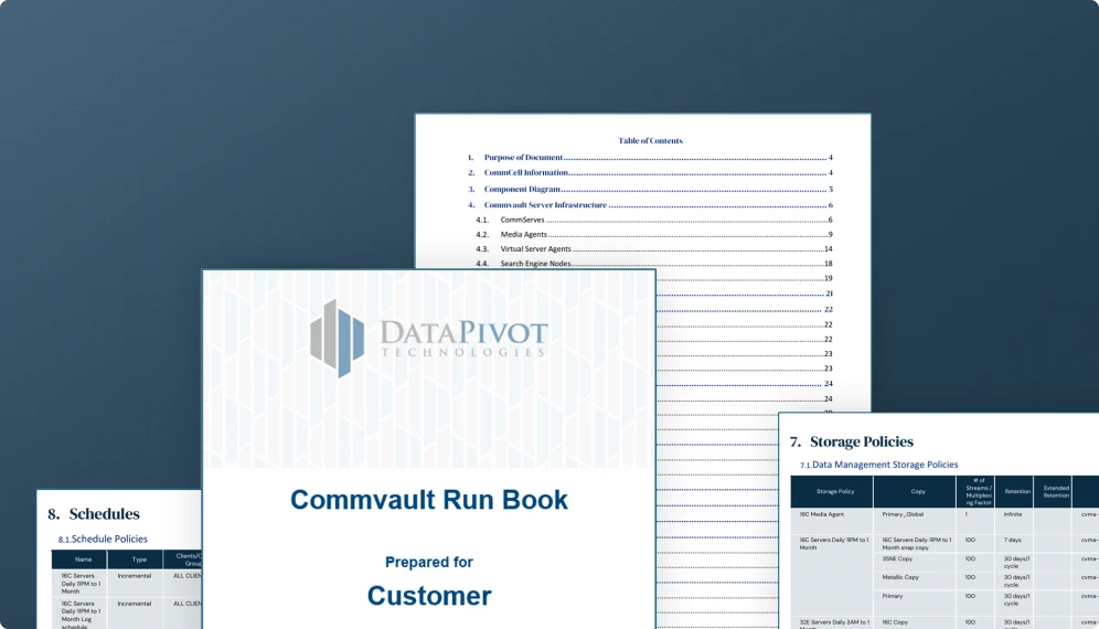 As part of our implementation services, DataPivot engineers provide detailed Run Books that document everything from the final design to the storage policies and schedules. As the environment changes over time, the Run Books are updated as well.